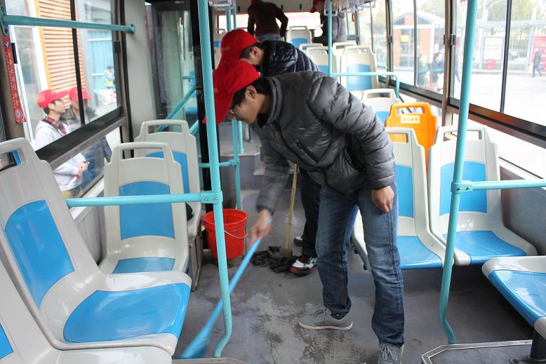一想到能够为公民出行提供一个良好的乘车环境,志愿者们一个个斗志昂扬,充满了为人民服务的热情。到了公交停车场志愿者们分成2组,女生拿着志愿者红旗排列站在公交场入口,有序引导乘客们上车,男生则负责对回程公交车进行清理工作。男生不仅擦了车的外部,还上车扫地,擦座位,干劲十足;女生认真耐心地为乘客解答各种疑问。志愿者用行动让市民们看到了当代大学生的奉献精神。从上午9:00至中午12:00扬旗公交志愿活动一共持续了3个小时。
