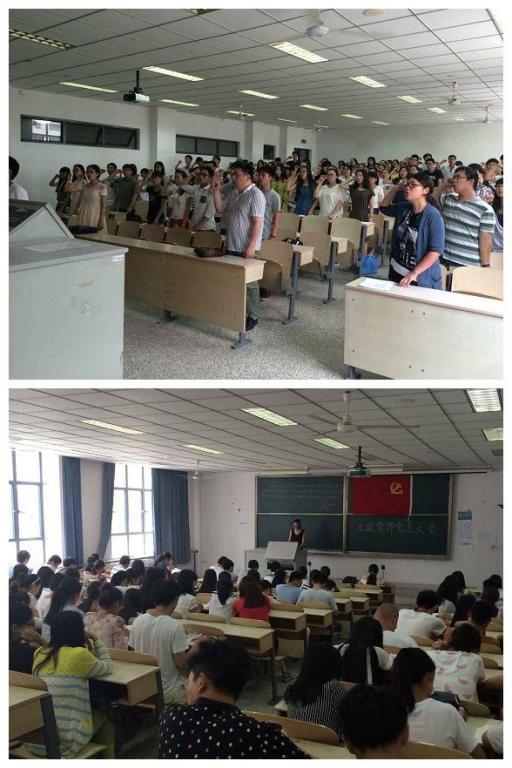 本次党员大会共有四项议程。封老师首先通报了今年上半年工程学部党员发展和转正情况。逐步壮大的党员队伍让大家欣喜,同时所肩负的责任也让大家感觉到应在各方面做好带头表率作用。接着,工程一支部学生党员陈祥同志带领全体新党员宣誓、老党员重温誓词,同志们热血沸腾,宣誓声音洪亮且有气势。之后,优秀毕业生党员代表顾云同志上台发言。顾云同志畅谈大学四年的生活学习,在党组织的培育指导下大家都成长成熟很多,党组织更教会了毕业生党员要怎样走好未来的人生征途。最后,封老师作为教师代表对毕业生党员寄予了希望,并祝愿大家在今后的人生道路上前程似锦,一帆风顺。封老师还指出,一方面,毕业生党员要站好最后一班岗,确保所有的2015届毕业生顺利平安离校;另一方面,在校学生党员要牢记党员义务,在近期的复习迎考期间,克己自律,并且尽可能做好考前帮扶和考风考纪宣传等工作。