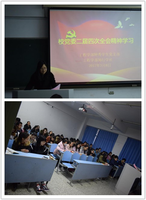 2017年3月8日下午,工程学部钟秀学生党支部在主教楼203教室召开了以“校党委二届四次全会精神学习”为主题的政治理论学习。本次会议由党支部书记牟蕾老师主持,工程学部钟秀学生党支部全体学生党员以及入党积极分子参参加了学习。