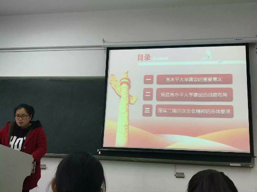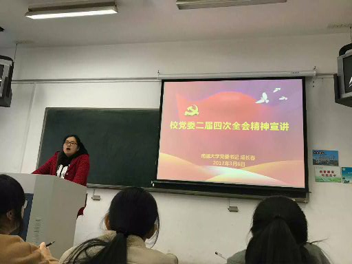 2017年3月29日在主教楼211举行了校党委二届四次全会精神宣讲,参加本次会议的有季海雁老师、陆潇潇老师、胡晓晴老师、韩婷老师以及党支部成员。