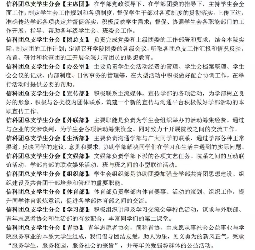信息科学部团总支学生分会,学校联系学生的桥梁纽带,温馨与感动围绕的大家庭。我们是不甘生存以上、生活以下的逐梦之人;我们也是攥紧青春、燃烧激情的担当少年;我们更是自我管理、无偿服务的学生工作者。我们流淌着炙热的血液,却也怀着不变的初心;我们有夸张离奇的创意,却也有朴实高效的行动。
