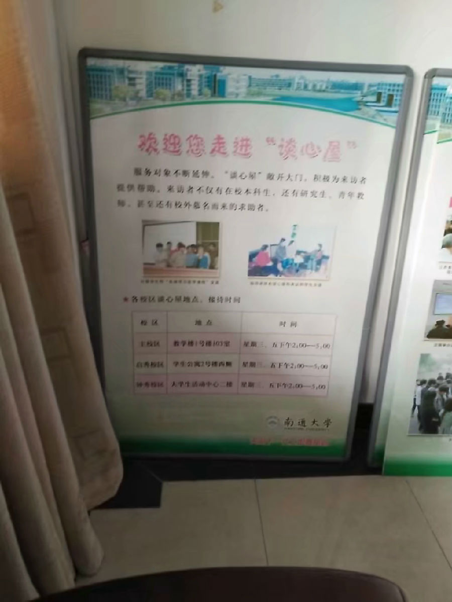 2017年11月8日,下午15:00,关工委庄老师来到了钟秀校区,在北门二楼谈心室和工程学部的同学们一起交流学习、生活方面的问题,帮助大学生解答心理困惑。