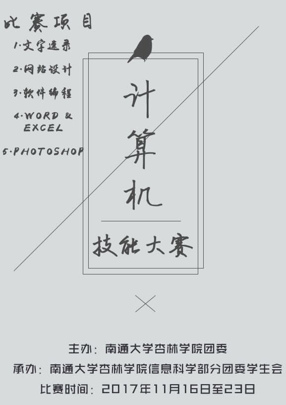 各位计算机大神们,由南通大学杏林学院团委主办,杏林学院信息科学部分团委学生会承办的计算机技能大赛即将拉开帷幕。