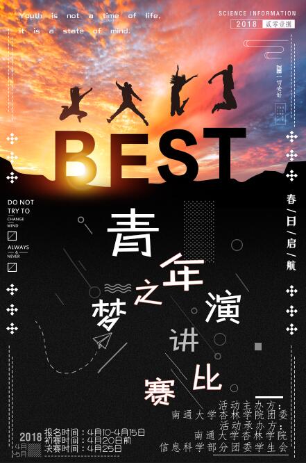青春岁月中的我们总是满怀激情、憧憬着未来;青春岁月也并非一帆风顺、事事如意。青春需要我们去奋斗,去追梦。为纪念“五四”爱国运动,响应学院“校园文化节”的号召,进一步加强校园文化建设,不断提高大学生综合素质,引导、激励学生继承发扬“五四”运动光荣传统,大力弘扬“爱国、进步、民主、科学”的“五四”运动精神,增强学生的责任感和使命感,勤于学习,善于创造,甘于奉献,现特举办“青年之梦·春日起航”为主题的演讲比赛活动。