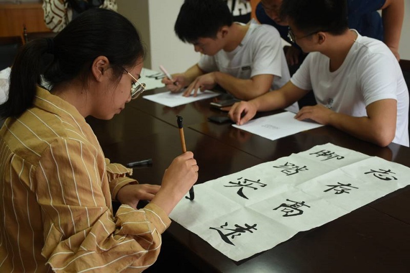 活动现场,几位同学分别展示了硬笔书法和软笔书法。硬笔写下的《竹石》,“粉身碎骨浑不怕要留清白在人间”,字里行间透露着廉洁奉公的风骨,毛笔写下的“脚踏实地,志存高远,功崇惟志”十二个大字,无不体现出中国传统文化对后人的引导和教诲。