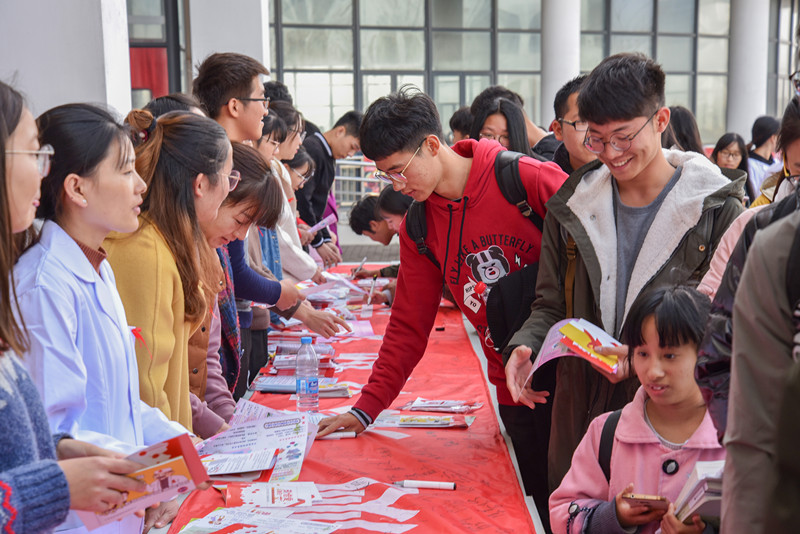 为迎接第31个“世界艾滋病日”的到来,南通大学杏林学院红十字会于11月29日中午在食堂前开展了防艾横幅签名以及有奖问答活动,人文学部红会分会积极组织同学参加了此次活动。活动受到了启东市疾控中心、妇计中心、启东校区管委会、杏林学院相关部门领导的关注和支持。