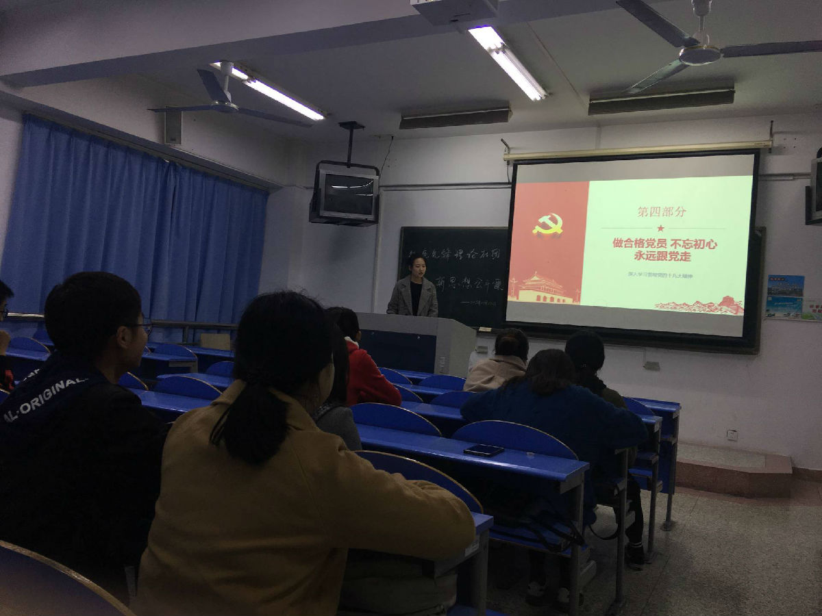 此次会议主要分为两个环节,第一环节由团总支副书记娄岩岩宣讲PPT。从党的全国十九次代表大会简介及重要意义、习近平总书记十九大报告内容精解;提高和保障改善民生;做合格党员、不忘初心;永远跟党走四个方面的内容做了系统的讲解。习近平强调五年来,我们勇于面对党面临的重大风险考验和党内存在的突出问题,这为党和国家事业发展提供了坚强政治保证。同时,我们的总书记也指出实现中华民族伟大复兴是近代以来中华民族最伟大的梦想。实现伟大梦想,必须进行伟大斗争。我们要不忘初心跟党走,面向未来,不忘初心、继续前行,为实现中华民族伟大复兴的中国梦不懈努力。第二环节,与会的积极分子就如何成为合格党员展开讨论,相互交换意见。我们要铭记于心:昨天合格,未必今天就合格;今天合格,不一定明天仍然合格。共产党员既然宣誓为党的事业奋斗终身,就会面对如何始终保持合格的问题。做合格共产党员,也是永远在路上。“心中醒,口中说,纸上作,不从身上习过,皆无用也。”一辈子做合格党员,基础是知行合一、坚守底线,关键是长期坚守、追求高标准。