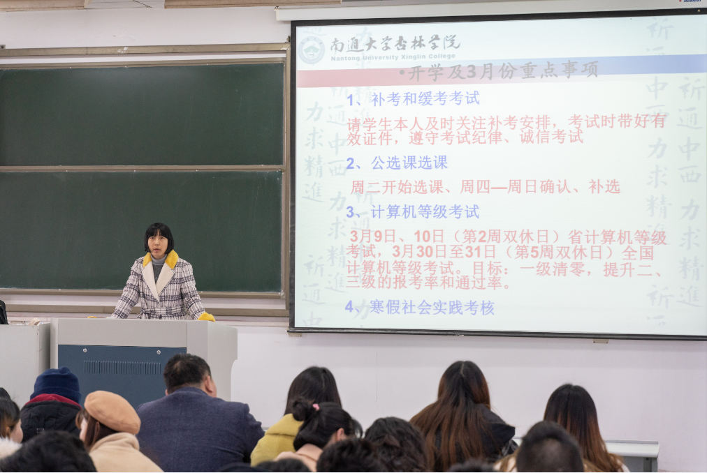 会议的主要内容为3月份的重点事项。首先是关于补考和缓考,王老师通报了上学期年级期末考试不及格和考试违纪情况,提醒同学们重视补缓考,严格遵守考试纪律,诚信应考。紧接着是关于公选课选课的事项,着重强调选课要跨专业选课,不可以重复选课。然后是再次强调计算机等级考试的重要性,她希望同学们能够珍惜每次机会,全力以赴备战等级考试,实现一级清零、二级和三级大幅度提升的目标。随后,王宁又对寒假社会实践的考核和高校学生信息补录工作进行了详细的讲解。最后,她一如既往地提醒同学们要注重课堂学习质量,提高学习效果,同时提高安全防范意识,确保安全稳定。