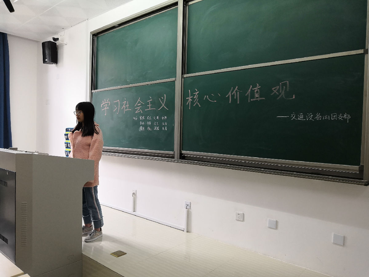 南通大学杏林学院(启东)交通设备181班在3月21号下午于JX 7-8举行了关于“学习社会主义核心价值观”的主题团日活动。参与本次活动的是交通设备181班的全体同学。