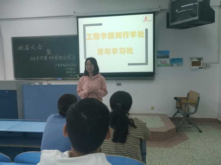 2019年5月9日,知行学社于主206举办了换届大会暨习近平新时代中国特色社会主义思想科学理论专题学习活动,本次活动由知行学社社长王丽君主持,知行学社全体成员参加。
