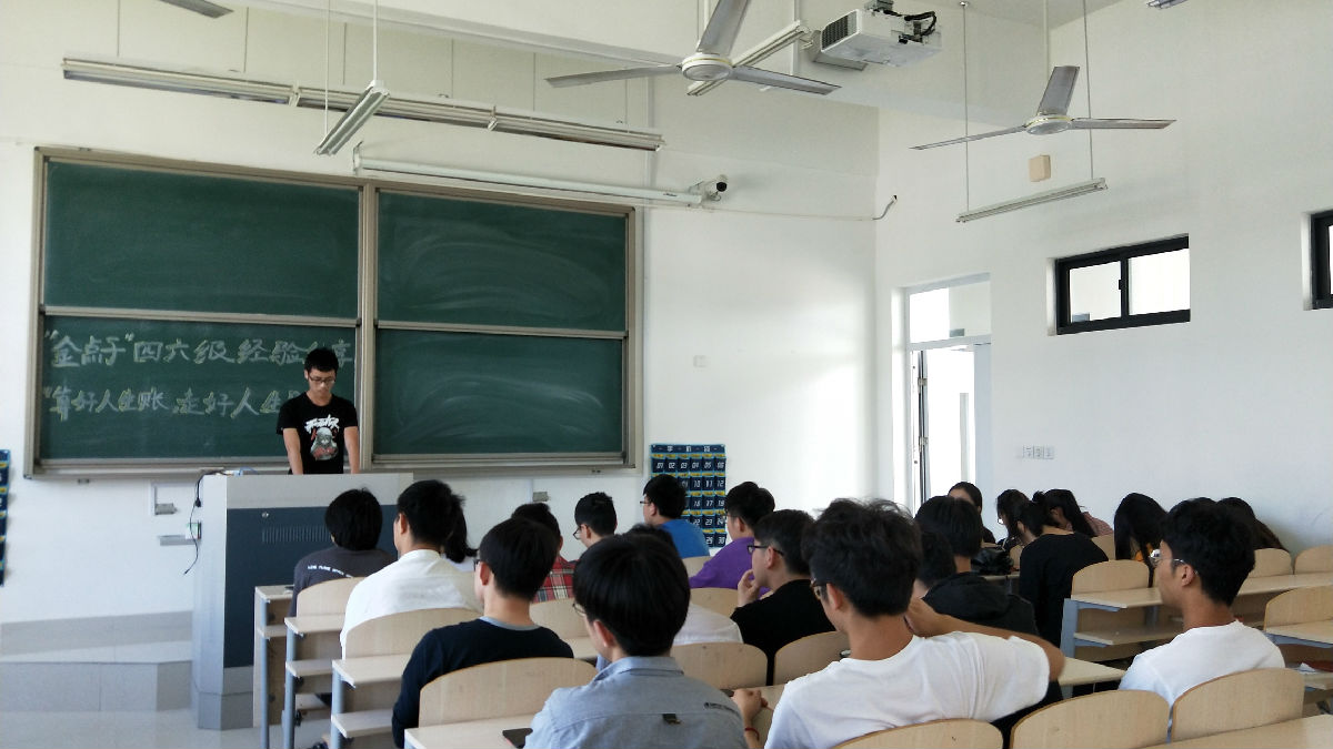 第一部分:四六级高分经验分享。分享人项林浩重点强调了英语单词积累的重要性,每天背一部分高频词汇,词汇是通过英语的基础。接着讲到培养英语听力能力可以多看英美剧,增加对英语单词的熟悉度。最后讲到了英语作文需要好的模板,大家可以自己搜索模板加以背诵,增加自己英语作文的得分能力。