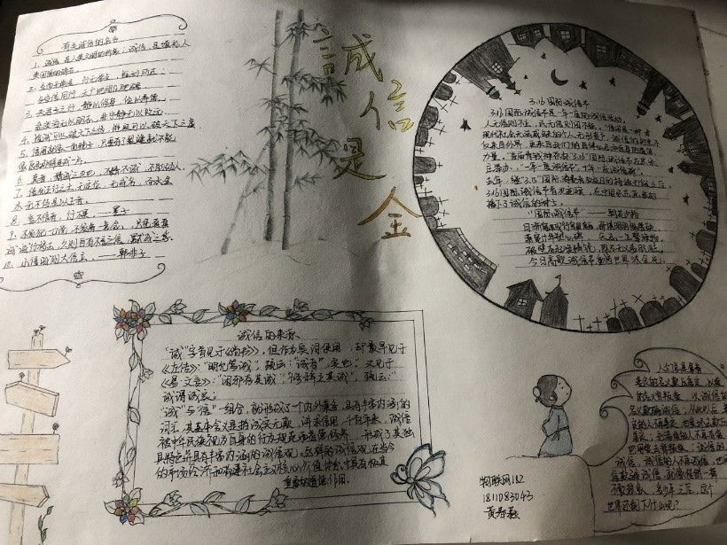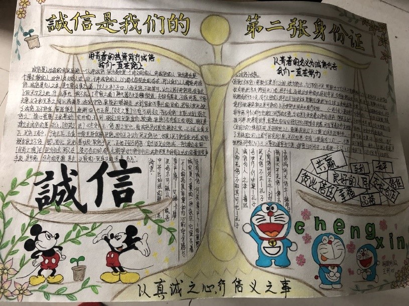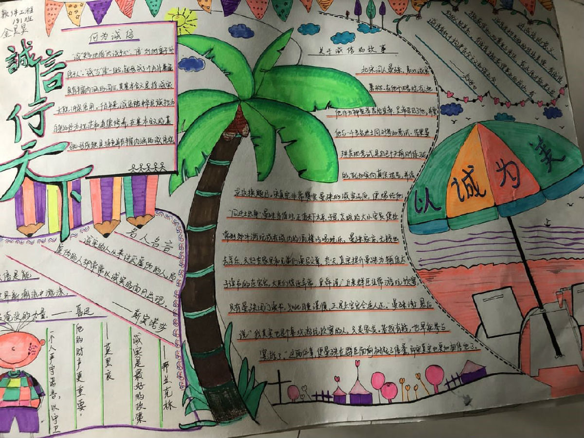 诚信,是中华民族的传统美德,是社会主义核心价值观的重要一环。它是做人之本、立身之道。通过这次诚信手抄报活动,同学们深切地感受到了社会需要诚信、人们呼唤诚信,诚信种子已经深深地埋在了每一个大学生的心里,相信同学们会从点滴做起,发扬中华民族的优良传统,让诚信之花开满校园。