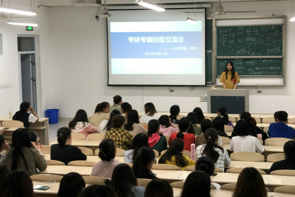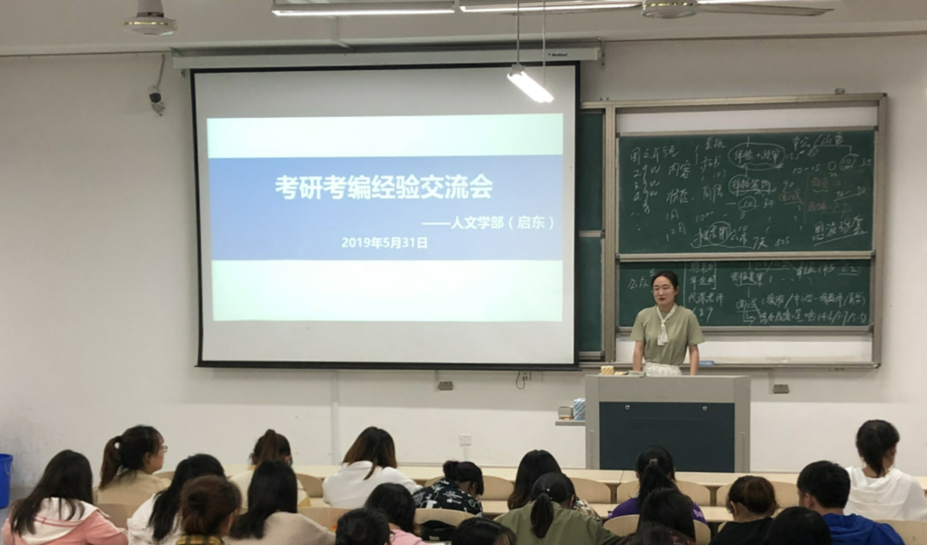 2019年5月31日晚,人文学部(启东)在JX3-4-107教室开展考研考编经验交流会。本次交流会共邀请了三位毕业班优秀学生代表中文152姜毛露、刘曌同学和英语151孟梦雪同学。交流会由中文162陈彦颖同学主持,16级、17级同学参加了本次活动。