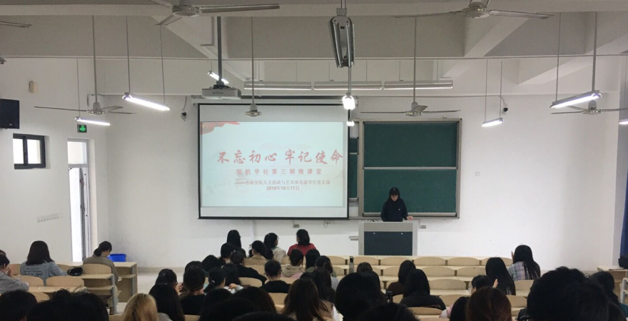 2019年10月17日中午,我院人文思政与艺术体育部学生党支部(青年学社——领航学社)在JX3-4-107教室开展了“不忘初心,牢记使命”第三期微课堂活动。本次微课堂由入党积极分子张思然主讲,以“党的初心和使命”为主题。全体预备党员及入党积极分子参加了本次活动。