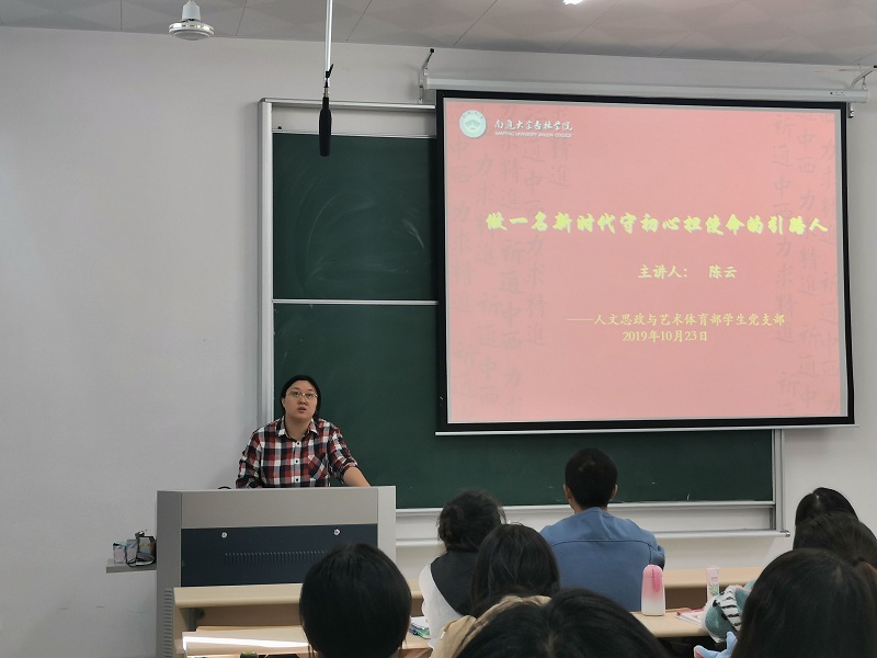 10月23日中午,人文思政与艺术体育部学生党支部“不忘初心牢记使命”主题党课活动在启东校区7-8-105教室顺利进行。活动由学部学生党支部书记陈云老师主讲,支部学生党员及各年级入党积极分子参加。