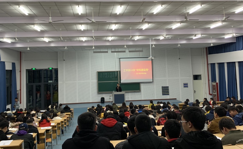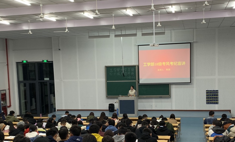 2019年12月1日晚上六点,工学部18级部分专业在7-8-102教室召开“学风建设月”考风考纪宣讲暨四六级冲刺讲座,焦琪老师作为会议主持人对计算机、自动化、软件、软嵌专业学生提出考风考纪上的要求。