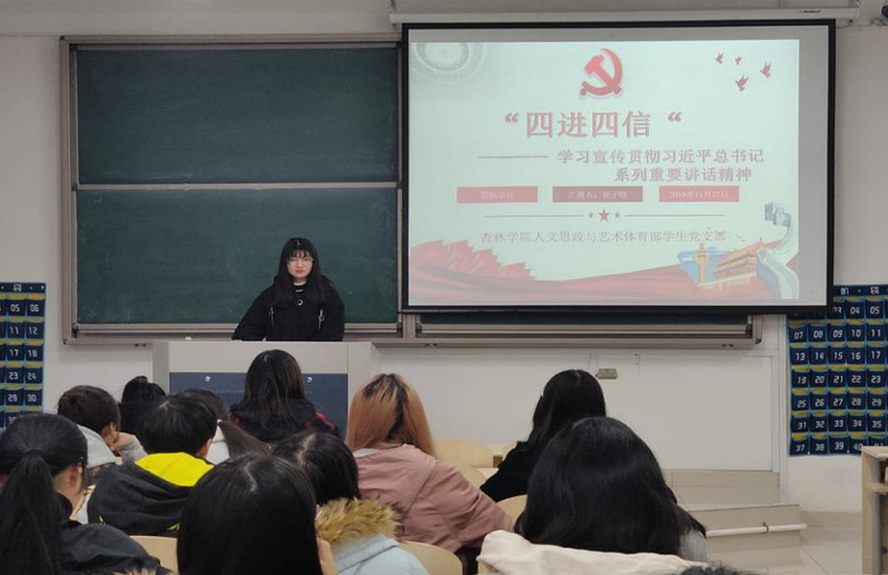11月27日下午,我院人文思政与艺术体育部学生党支部(领航学社)在JX3-4-106教室开展了“四进四信”主题教育活动。本次活动由崔子晗同学主讲,辅导员陈芳芳老师、17级和18级领航学社成员参加了本次活动。