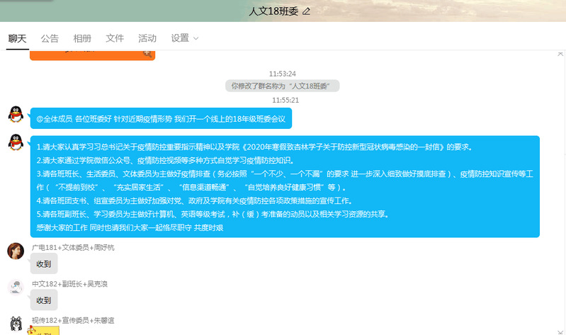 人文思政与艺术体育部18级于2020年2月3日召开线上年级班委会议,会议由人文思政与艺术体育部18级辅导员吴子飞主持,学部18级全体班委悉数参加会议。