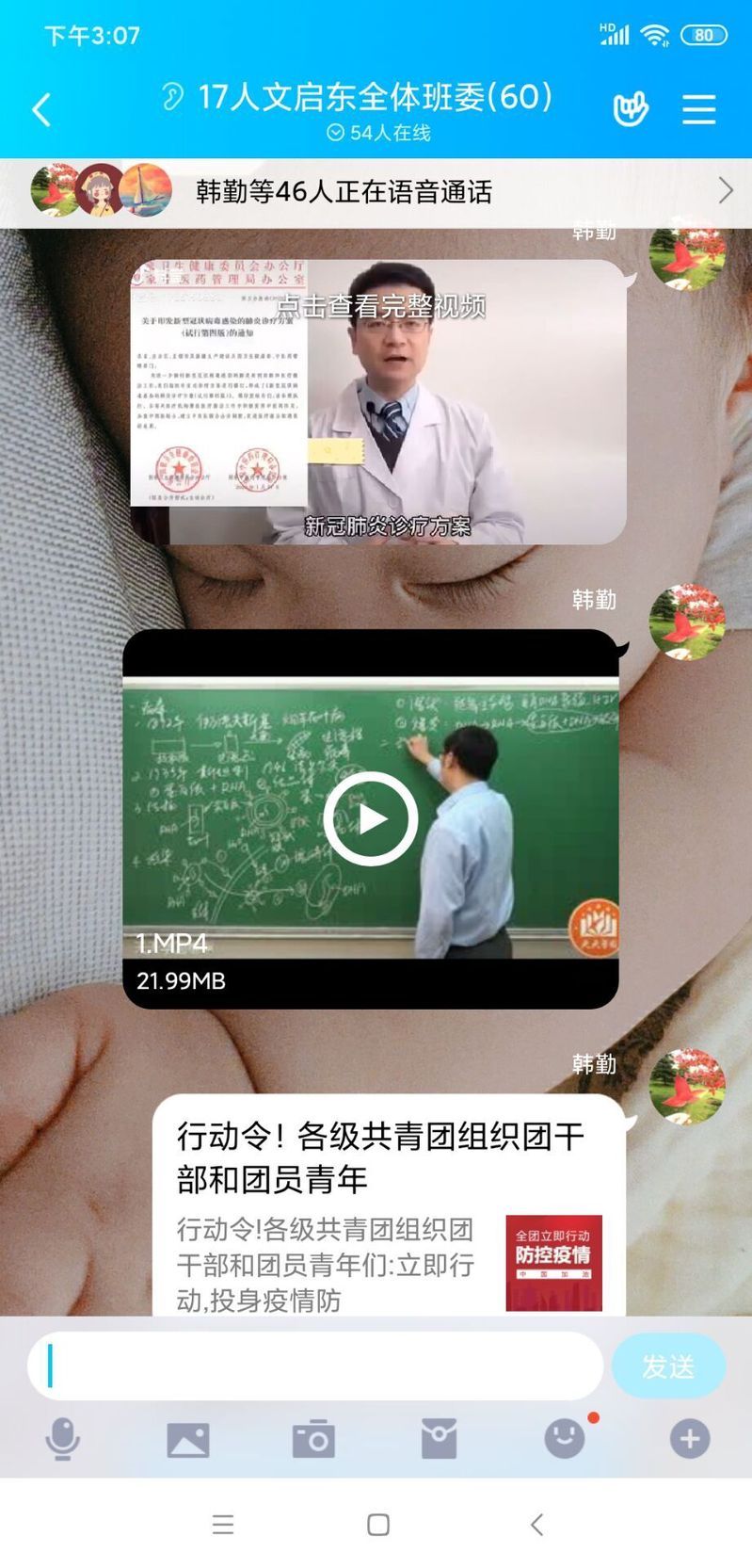 2020年2月3日,2017级人文思政与艺术体育部围绕新冠肺炎疫情防控和寒假期间工作的开展举行了一场线上交流会议。本次会议由中文172班班长顾燕主持,17级全体班干部进行在线交流。