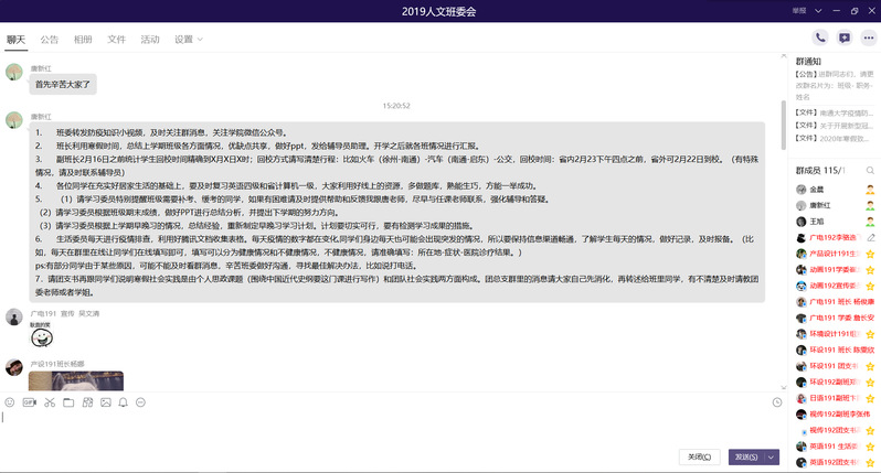 此次线上班委会共分为三个部分。首先,辅导员播放了疫情防控知识小视频,并围绕当前疫情,带领班委们学习《关于立即行动起来投身新型冠状病毒感染肺炎疫情防控工作的通知》和学院《2020年寒假致杏林学子关于防控新型冠状病毒感染的一封信》,并对其中重要的几条做出了特别讲解。其次,年级学生干部做工作交流。各班班长汇报班级最新疫情排查情况,确保疫情在可控范围内;各班学习委员围绕班级期末考试情况、补考(缓考)情况、后进生补差情况做出汇报分析;各班团支书对寒假社会实践情况做交流发言;中文191团支书许子扬和中文192团支书陈鞠颖作为代表,分享了“学习疫情防控中的先进典型”。最后辅导员要求每位学生干部按学校和学院要求,进行自查,落实疫情防控,确保无漏报、瞒报。此外,就寒假期间的重点工作进行了总结。