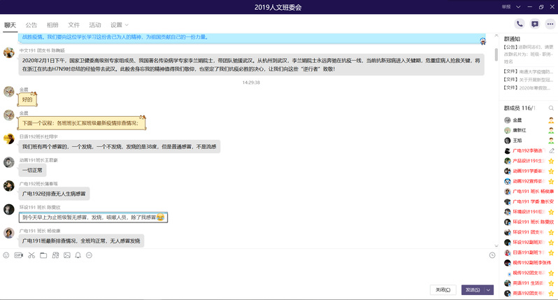 2020年2月2日14时,人文思政与艺术体育部19级辅导员金晨老师和唐新红老师组织了一次特殊的班委会——线上交流,19级所有班委参会。