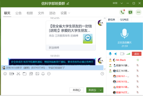 紧接着年级学生分会主席陈柏豪围绕学习贯彻学院一封信要求做工作布置,其他学生干部进行工作交流。年级宣传部长宋佳丽指出每位同学要通过网络渠道,加强自身健康教育,宣传普及疫情防控知识,要自觉清朗网络空间,严防各种谣言扩散,增进个人心理健康,培育自尊自信、理性平和、积极向上的健康心态,自觉维护社会和谐稳定;学习部长李松泽强调居家期间学习一定不能落下,开学有缓考、补考的同学,四六级和计算机等级考试没过的同学应抓紧时间复习,做好充分准备。每位同学及时主动联系毕业设计导师,利用假期对自己的毕设做好规划,加快毕业设计(论文)工作的推进,有意向就业的同学积极通过网络,参加就业单位应聘,各班委要及时传达学院下发的各种招聘信息;文体部长张慧云希望广大同学调整作息时间,丰富居家生活,积极进行体育锻炼,增强体质,提升抵抗力。