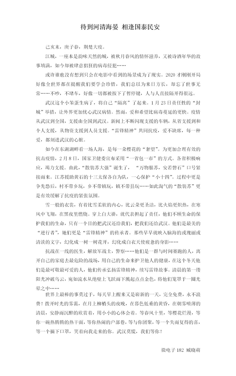 文章简述了武汉疫情的发展状况,赞扬了在抗疫第一线的工作人员和所有捐赠者的“雷锋精神”,以及表达了对武汉的喜爱和国泰民安的期待。