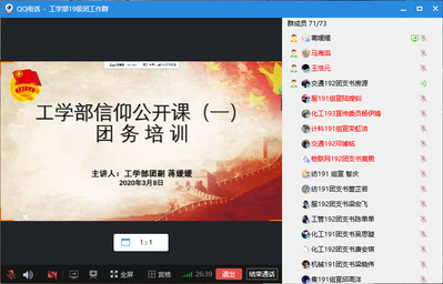 为坚决打赢疫情防控阻击战,减轻疫情对正常开学造成的影响,3月8日下午,我院工学部于线上平台开展了信仰公开课(一)团务培训会。本次会议由工学部学生团工作负责人蒋媛媛主持进行,工学部全体19级团支书参与会议,工学部学生分会主席王浩元、宣传部部长马海滔等学生干部旁听指导。