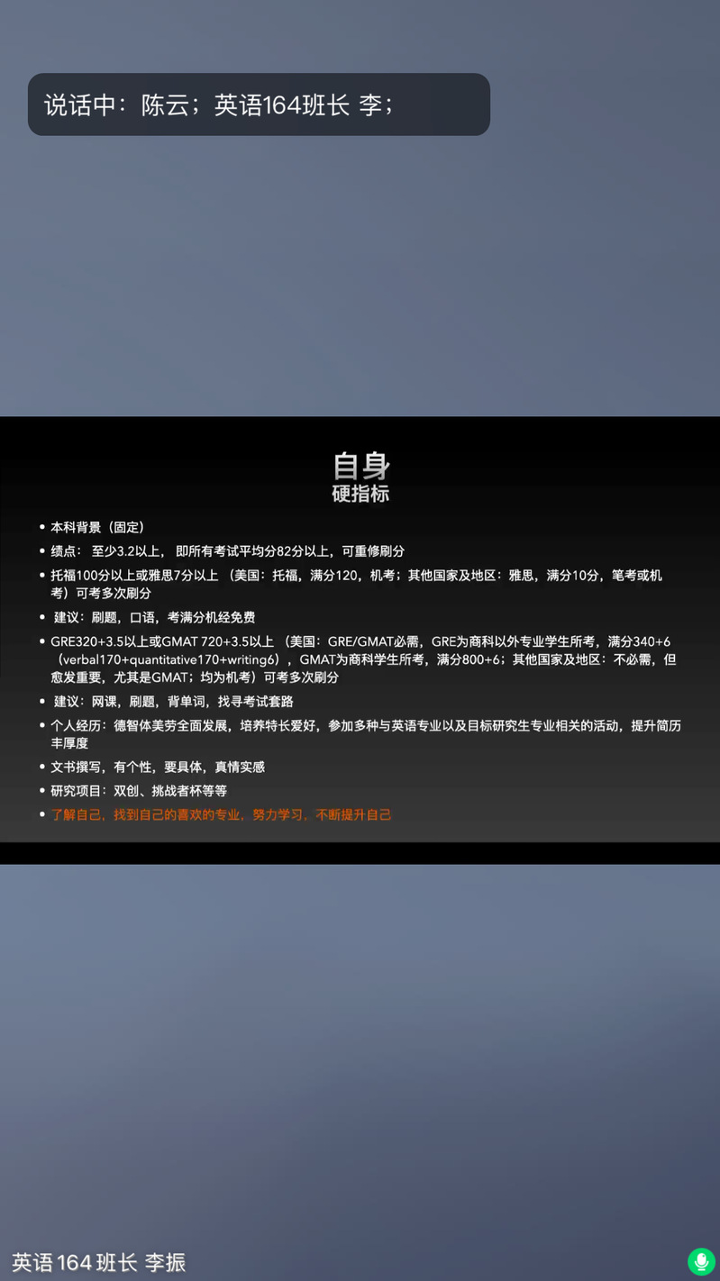 此次交流会邀请了英语164班考研初试415分的朱丹妮和被7所国外高校研录取的李振。会议伊始,学部学工办主任陈云寄语同学们要树立明确目标,坚定理想信念,严格要求自己,并鼓励大家珍惜大学美好时光,汲取优秀学长学姐成长成才经验。之后,朱丹妮分别从如何找准专业及院校、考研复习时间安排、专业课与公共课的复习方法等方面分享了她的考研经验;李振从出国留学所需的硬性条件以及如何高效地达成目标作了系统的讲述;最后,陈云老师通过自己的经验对英语专业就业问题作了介绍与解答。