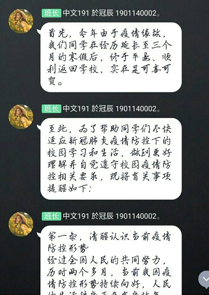会议开始,唐新红老师强调此次返校须知年级会是为了守护学生身体健康和生命安全,确保学校正常开展教育教学工作。因此,希望每一个同学都能够认真对待此次会议。然后,金晨老师对开学时间,自我防护要求,返校途中要求,返校注意事项,健康检测要求等五个方面进行全方位的解释说明。辅导员们希望,每一个学生都能够按照学校要求,积极配合,安全到校。接着,辅导员们询问了每个班的班委,了解同学们疫情期间的线上学习情况,表明虽然返校时间一再推迟,但是我们“停课不停学”。不能因为疫情的干扰就怠慢甚至放弃学习。疫情面前,学生,各科教师和辅导员要拧成一股绳共克时艰!最后,辅导员们耐心解答了同学们提出的问题,并期待着与同学们在学校的相会。