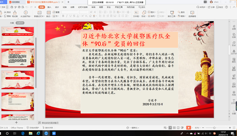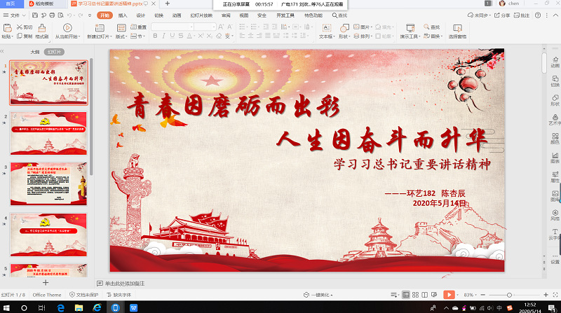 “青春因磨砺而出彩,人生因奋斗而升华”,为推动“青年大学习”走向深入、取得实效,人文思政与艺术体育部学生党支部(领航学社)于5月14日中午进行线上本学期第九期微课堂学习活动,本次微课堂的主题是学习习近平总书记讲话,由环境设计182班陈杏辰主讲,学部领航学社全体成员参与。
