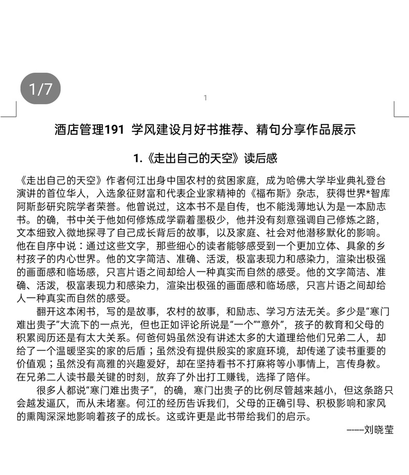 学风特指学生的学习风气,学风包括学习风气、治学风气和学术风气。为响应校园的号召,进一步加强学风建设,帮忙同学们掌握良好的,更好地学习专业知识,提高自身的竞争实力。南通大学杏林学院学风建设主题活动于近期5月13日—6月9日展开。本次酒店191班学风建设月的好书推荐活动由班长张雨涵和团支书王娟牵头开展。