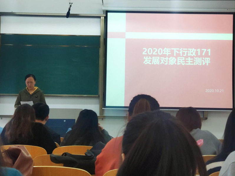 2020年10月21日,行政171班在1-2 301开展关于林悦同学为发展对象的民主测评会。此次会议由辅导员赵亚娟老师组织并主持。行政171班全体同学出席此次会议。