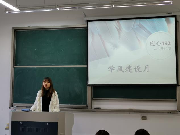 活动最开始,团支书先上台告知大家本月为学风建设月,强调学习的重要性。之后,学习委员上台,首先先谈综测与奖学金,并列出上学年本班同学的奖学金获得情况。其次说明考核成绩与绩点的关系,以及积欠学分的后果,意在让同学们多多关注学分和绩点,可以顺利拿到学士学位。最后是本次英语四级与计算机一级的通过情况,学生学士学位授予与英语四级和计算机一级也有重要关系,班级目前四级和一级通过率值得引起大家的重视。