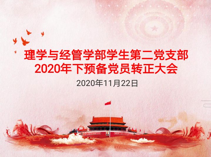南通大学杏林学院理学与经管学部学生第二党支部2020年下预备党员转正大会于2020年11月22日上午9:45在综合楼210会议室召开。本次会议由赵亚娟同志主持,支部全体党员通过线上和线下的方式参加了会议。