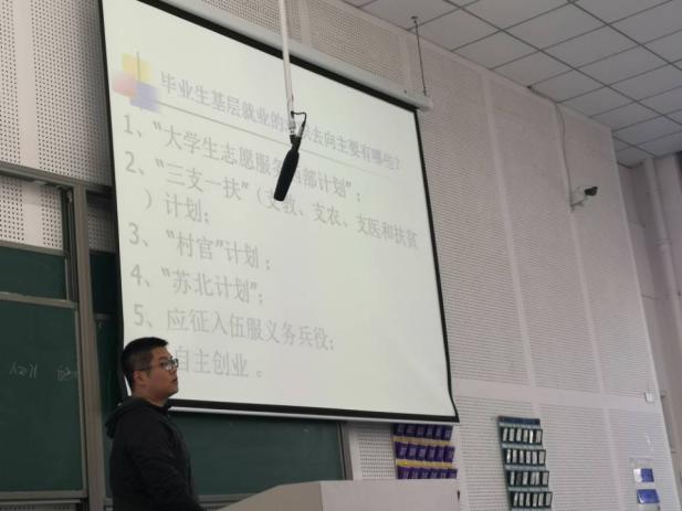 会议开始,吴飞老师结合同学们目前的学业成绩,从绩点、英语四六级以及计算机等级方面分析了本学部顺利拿到学位证和毕业证的通过率,同时督促有欠缺的同学抓紧相关科目的复习报名等工作,以达到学院毕业要求;紧接着吴飞老师就成绩单、就业推荐表、协议书等就业相关材料作出强调和使用说明,要求本着对自己负责的态度及时备份及保管。接下来,吴飞老师为同学们梳理了各个就业渠道的时间,为同学们推荐了一些岗位及方向,鼓励同学们积极进行尝试和做好充分准备。最后,吴飞老师毕业生就业需要办理的相关手续及流程。