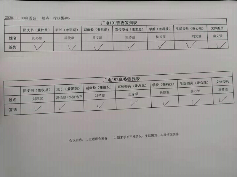 11月30日中午,广电191和192班全体班委在启东校区行政楼406会议室召开班委会议,会议由班主任崔老师主持。