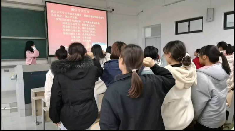 在宣誓活动中,班长首先向同学们强调了诚信考试的重要性,并再三告诫同学们在考试中不能作弊。其次,班长布置了期末考试复习安排。最后,学习委员带领全班同学进行宣誓。过本次宣誓活动,增强了同学们的诚信意识。同时,也加强了同学们面对期末考试的信心。