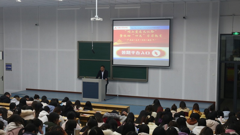 会议伊始,高青松明确了期末考试的要求,正确引导同学们遵守考场纪律,考前做到“三光”,把好考风考纪,考试时切忌作弊。随后,本次大会重点传达解读了十九届五中全会的精神,从“四史”的由来与要求、网络资源、基础知识、经典文献、最新文献以及学习的目的和意义六个方面展开,给予了同学们要铭记领袖嘱托,不忘初心,发奋学习的期望。