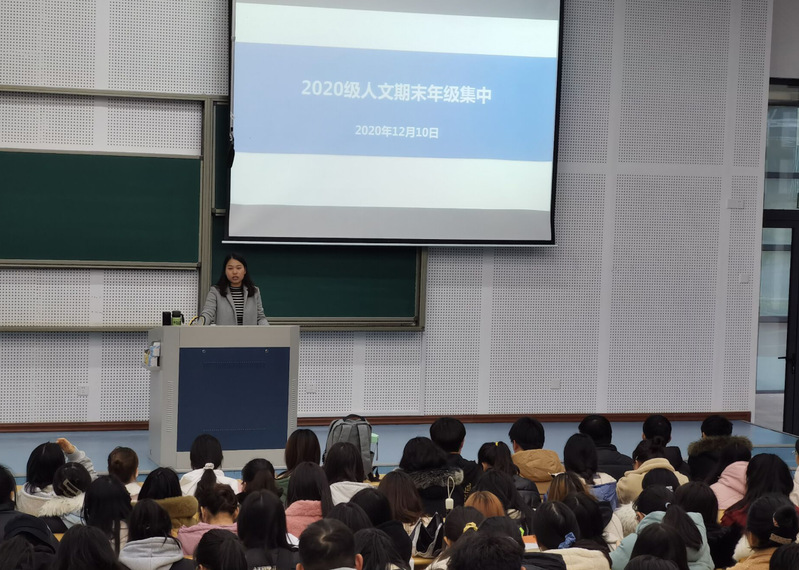12月10日下午,人文思政与艺术体育部2020级期末年级集中在启东校区JX7-8-110教室召开。此次会议由新生辅导员陈芳芳老师主持,中文、英语、动画、产品设计四个专业的全体同学参加了会议。