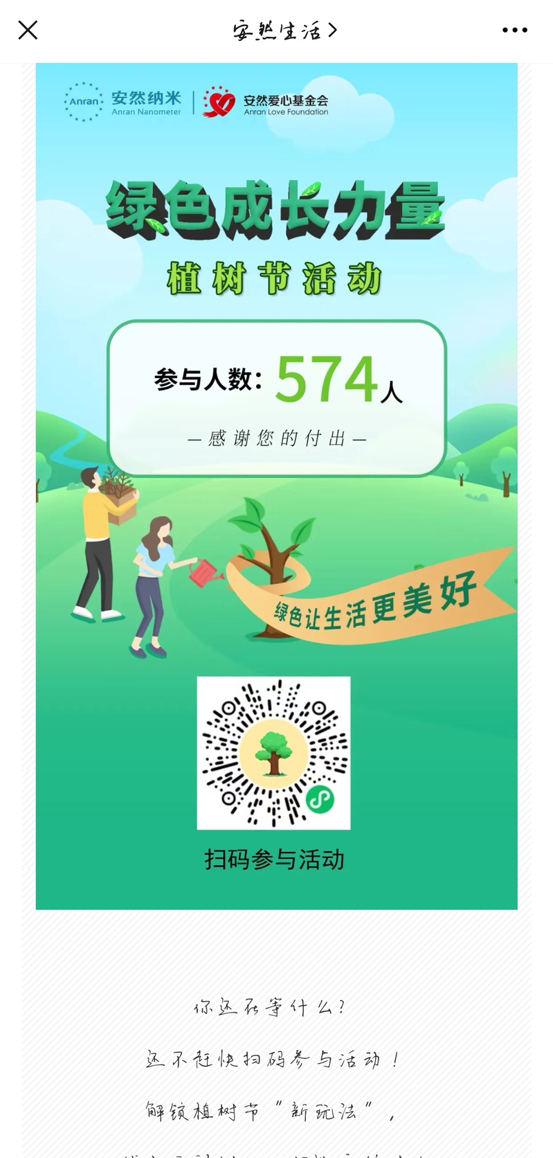 本次活动同学们可以通过微信小程序——“安然生活“公众号,参与线上虚拟植树,连续7天打卡或完成任务,即可获得水滴,使小树苗成长并换取兑换积分,最终凭借积分即可兑换安然义务植树尽责证书。