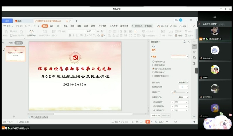 2021年3月13日,理学与经管学部学生第二党支部组织开展了2020年度组织生活会及民主评议,会议由支部书记许静静主持,支部全体党员参会。