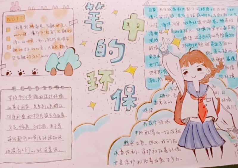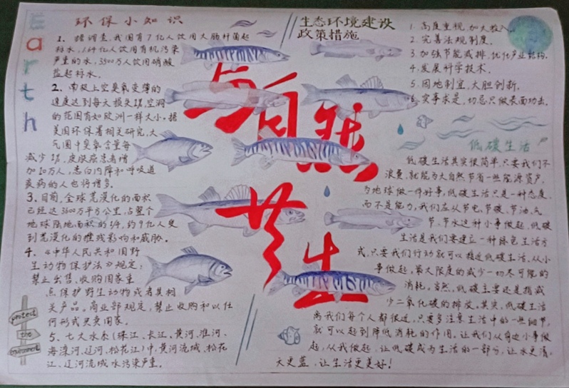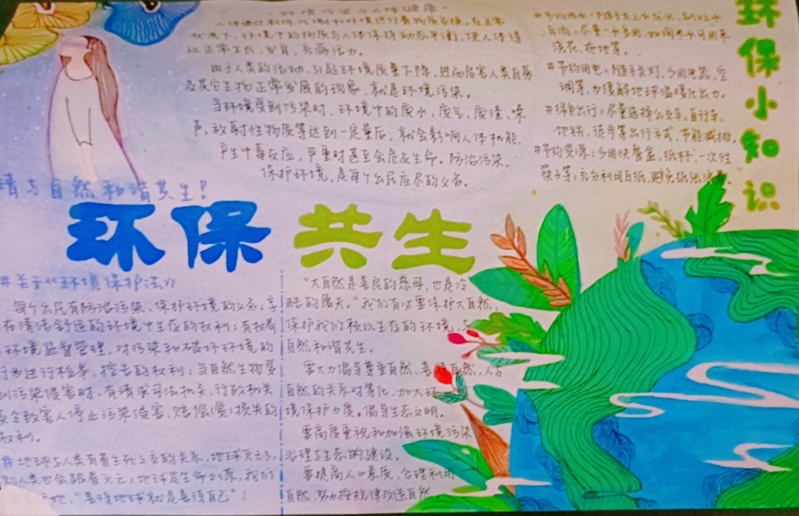 通过本次“笔中的环保”创意手抄报征集,不仅丰富了大学生的校园文化生活,展现了学生的动手能力和艺术风采,烘托了当代大学生健康,创新的精神风貌,也加强了学生对环保的知识储备,为打造健康的大学生活,积极推进了校园文化建设奠定了基础。