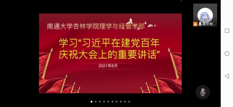 8月13日,理学与经管学部青年学习社组织社内同学们线上学习了“习近平在建党百年庆祝大会上的重要讲话”。