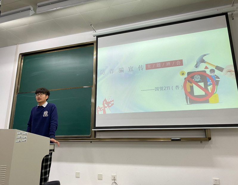 11月29日晚,国贸211于1-2教学楼203教室开展防诈骗宣传主题班会,由班长孔润民主持。