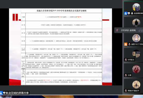 会议开始,赵老师讲解了寒假社会实践的相关通知,学院、学部各个层面的活动以及评分标准和要求。随后,团副赵程璐、杨旭分别就如何进行PU学分申请和调研报告撰写方面为大家做分享。同时赵程璐结合参加“一起云支教”活动的经验作分享。