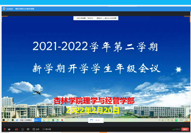 2月20日,20级人力营销物流专业在线召开新学期线上会议,会议由辅导员罗晶晶老师主持,学部综合办公室主任范赟老师,班主任杨俊老师和年级全体学生参会。