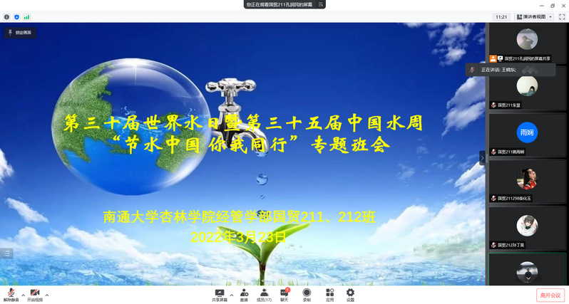 3月23日下午,为深入贯彻习近平总书记关于生态文明的思想,认真落实党中央、国务院关于节水工作的重大决策部署,提高公共机构干部职工节水意识,发挥公共机构示范引领作用,促进形成全社会节水的良好风尚,杏林学院(启东校区管委会)服务保障办公室、国贸211.212班主任王晓东为国贸211.212班级的同学们开展了有关学习如何宣传节水活动主题班会。