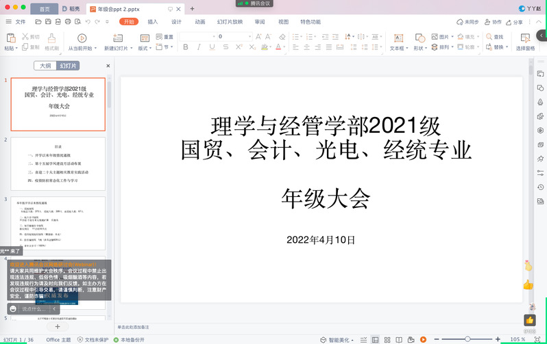 4月10日晚7:30,21级国贸、会计、光电、经统专业依托腾讯会议召开4月线上年级大会,本次会议由年级辅导员赵亚娟老师主持,特邀学部教务黄芸老师、各班班主任参会。