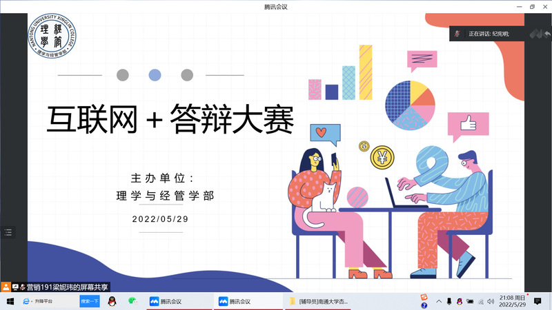 2022年5月29日,南通大学杏林学院理学与经管学部举办了2022年“互联网+”大学生创新创业大赛答辩与指导会。学部主任纪宪明老师、工学部张茜老师、理学与经管学部朱建新老师、罗达峰老师和许静静老师担任本次大赛评委。